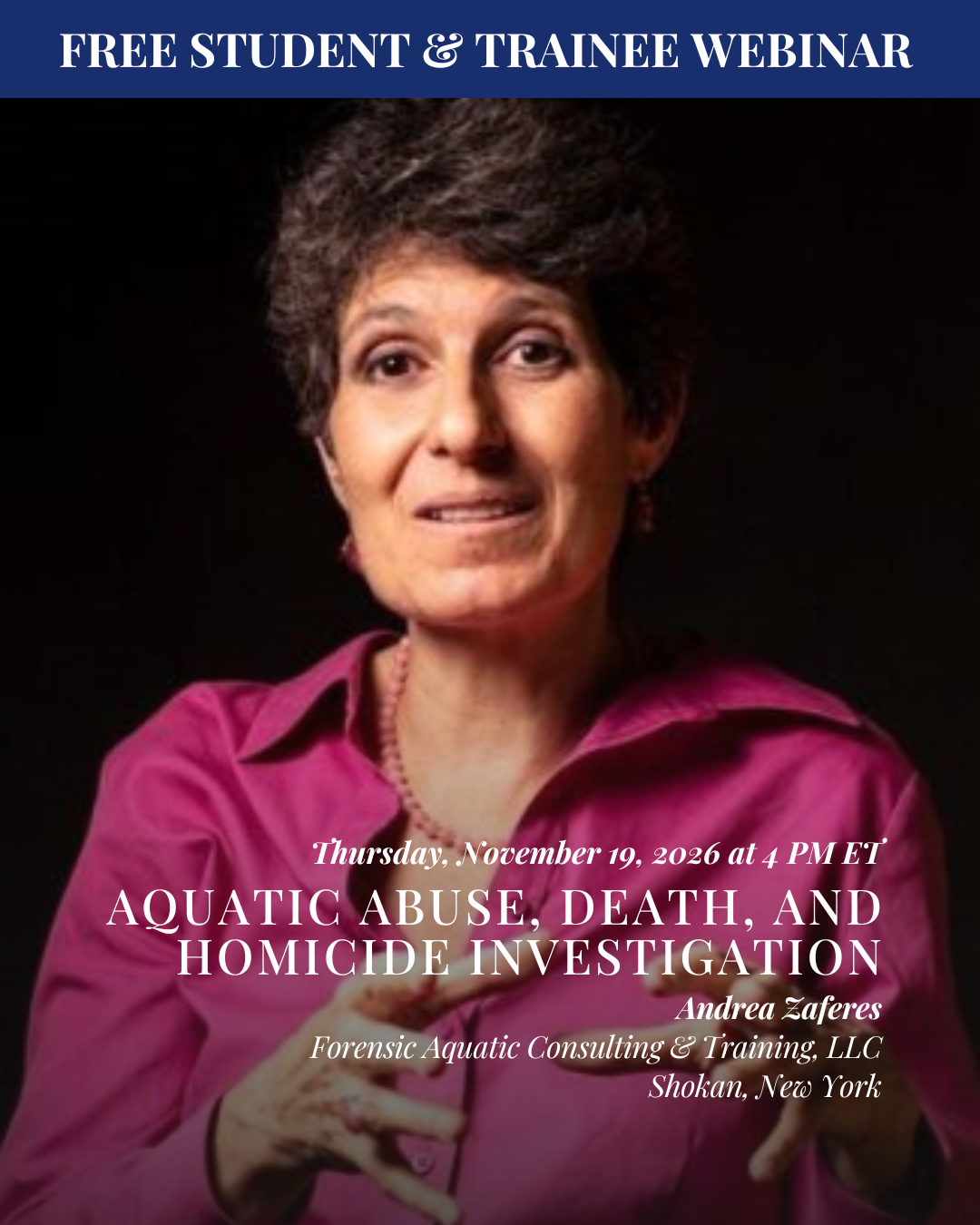 "Aquatic Abuse, Death, and Homicide Investigation" Link to register for event: https://us06web.zoom.us/webinar/register/WN_HV6wfL_6TFmM29mKfj_rjA